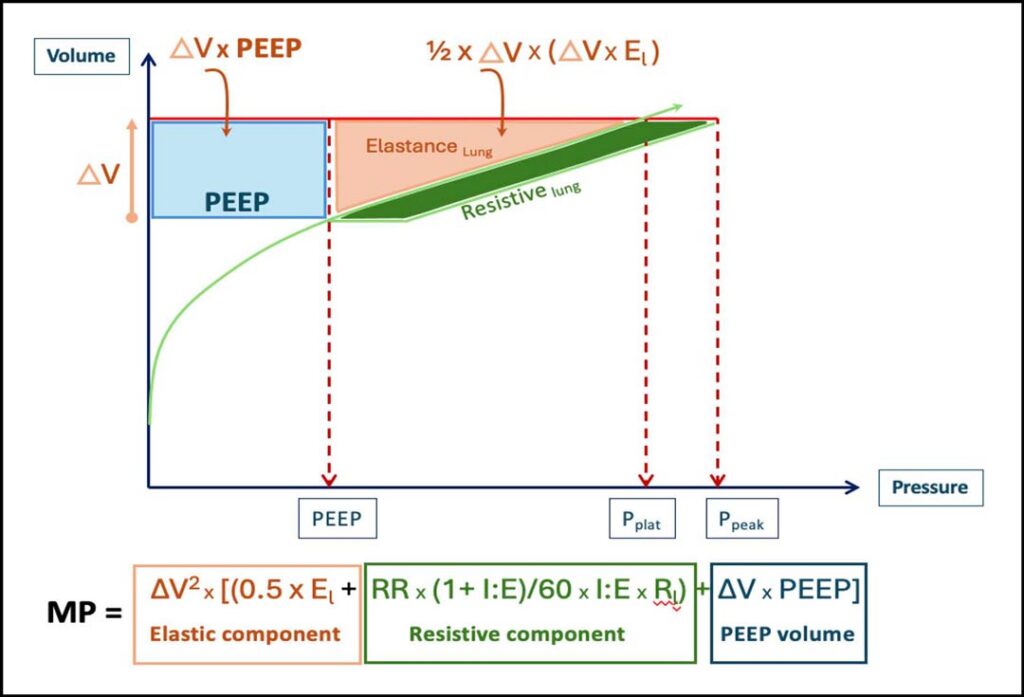 MP integrates the effect of tidal volume, airway pressure (including driving and peak pressure), flow, and respiratory rate, quantifying the contribution of respiratory rate and the positive end-expiratory pressure to the total power delivered by the ventilator. MP-based strategies aim to minimize unnecessary power delivery and reduce harm. Mathematically, the power equation is derived from the equation of motion multiplied by the changes in lung volume and respiratory rate.1–2